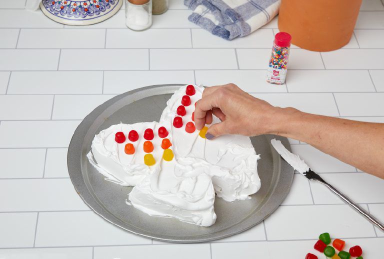 Step 6: Decorate your butterflies. Mix food coloring into white icing if you’d like to create different colors. Or use candy or fruit to create patterns or antennae. Or dust the cake with sprinkles for a kaleidoscope of colors. Or do all of the above!