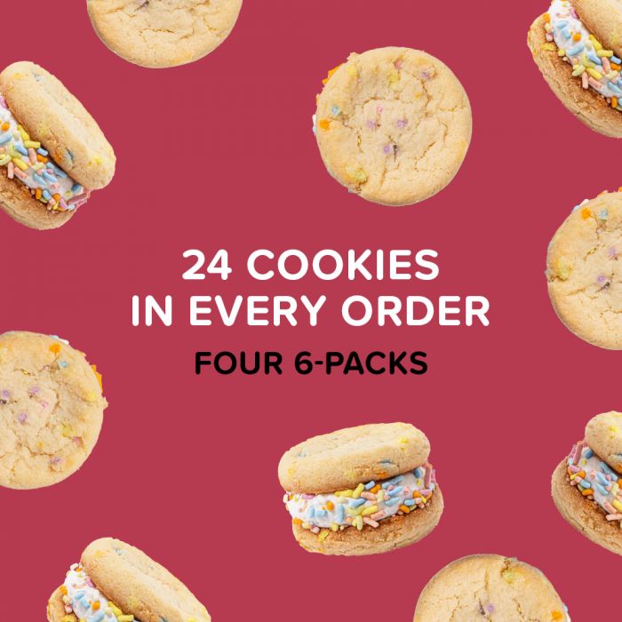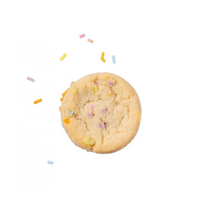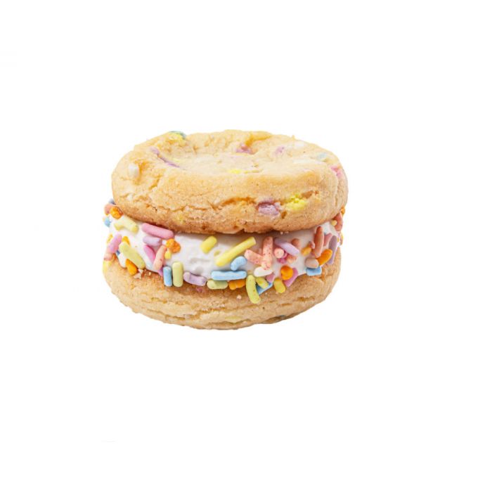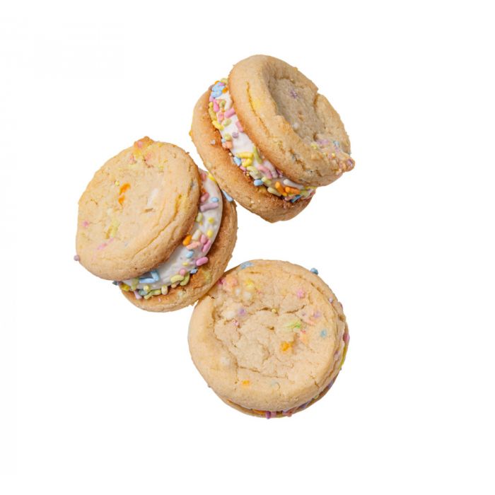 Two soft sugar cookies filled with vanilla buttercream icing and rolled in rainbow sprinkles. Each cookie packs a party that’s sweet enough to share – or to celebrate all by yourself.